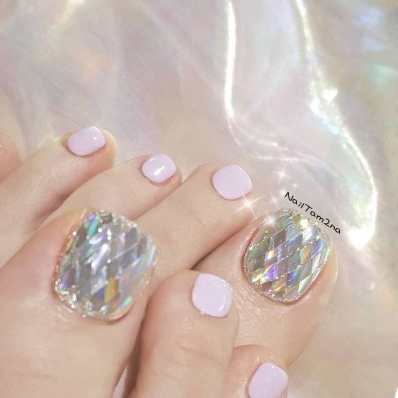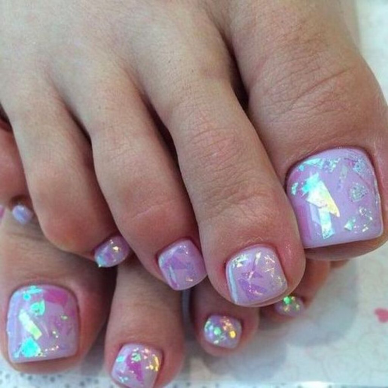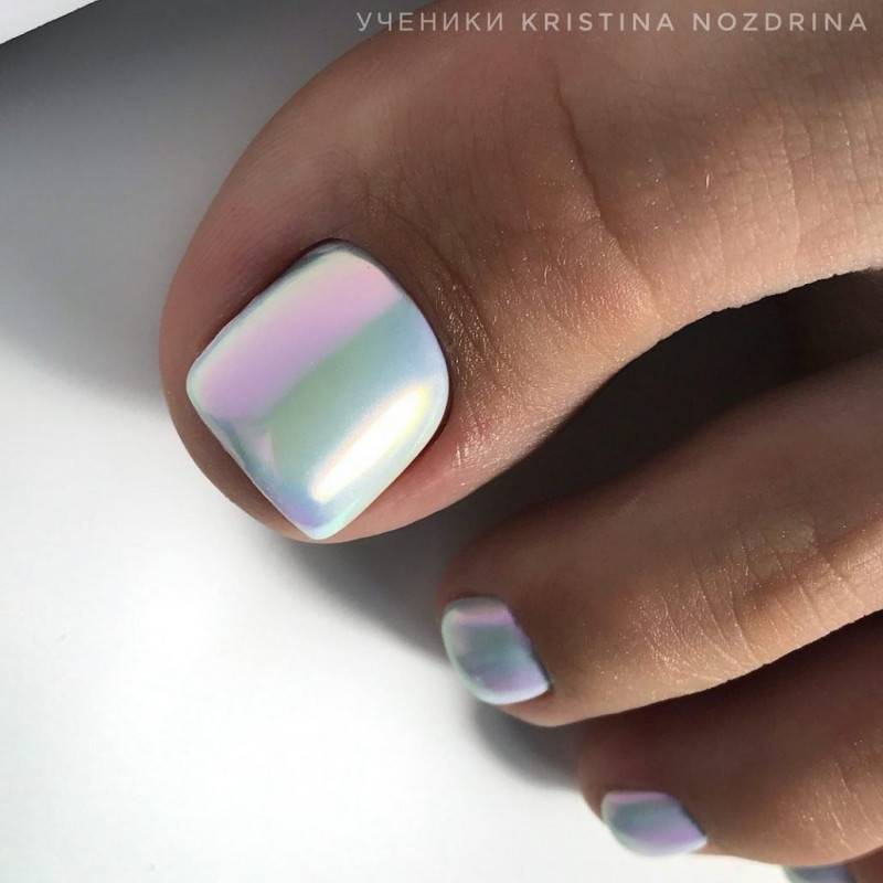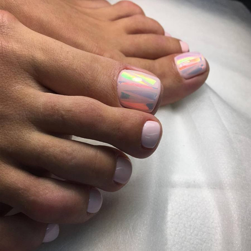 Этот вид дизайна уже давно завоевал популярность среди модниц. Однако для маникюра он кажется самым ярким, поэтому его принято делать не на всех ногтях. А вот для педикюра — самое то! Тем более, что голографическая втирка признана одним из трендов весны 2024 года.