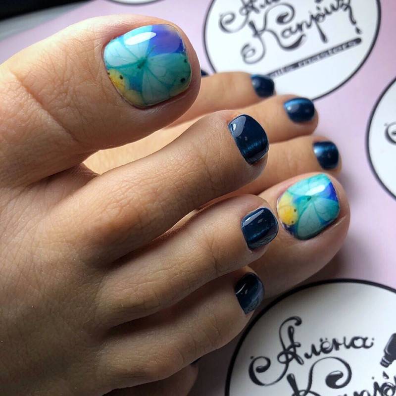 Цветы разных форм и оттенков на ногтях особенно актуальны в теплое время года. Когда кажется, что цветы должны расти не только на клумбе, но и на ногтях. Флористика позволяет мастеру сочетать разные цвета — черный и красный, белый и синий и многие другие варианты — на что хватит фантазии. Также образцы для такого покрытия и идеи можно брать в народных узорах. Например, хохлома и гжель очень выгодно будут смотреться на большом пальце ноги.
