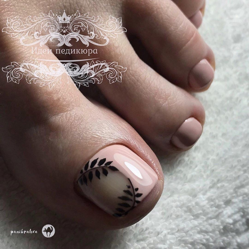Клиентка не хочет делать слишком яркий дизайн? Тогда предложите педикюр с дизайном на большом пальце. Основные ногти можно сделать однотонными, а для экспериментов оставить самый крупный палец.