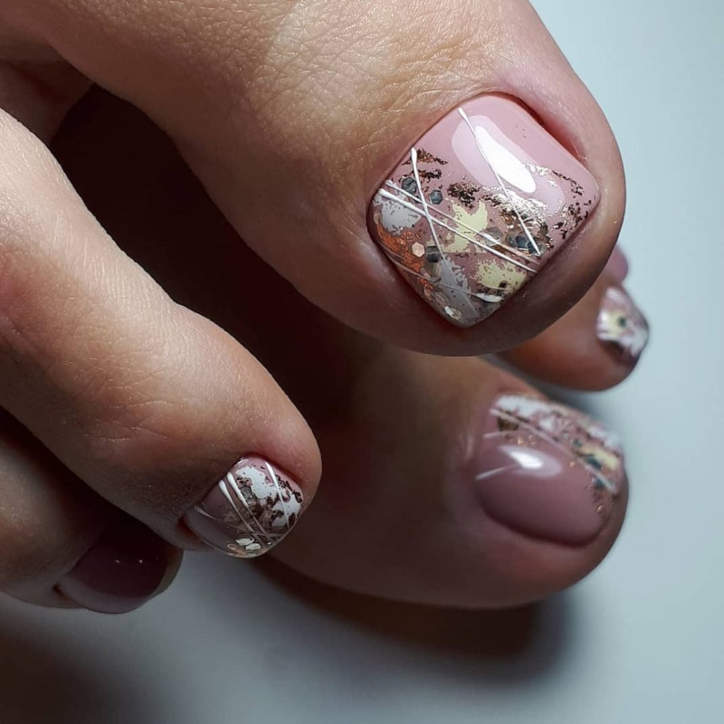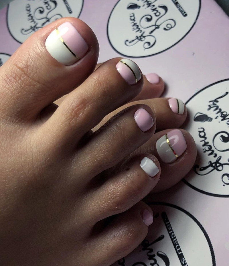 Этот вариант можно отнести к самым спокойным универсальным. Такие оценки стоит выбирать, если вы не можете определиться, какой сделать педикюр. Но при этом вам хочется, чтобы он был очень стильным и модным. Какие оттенки подойдут для создания интересного дизайна, который подойдет под любую открытую обувь.