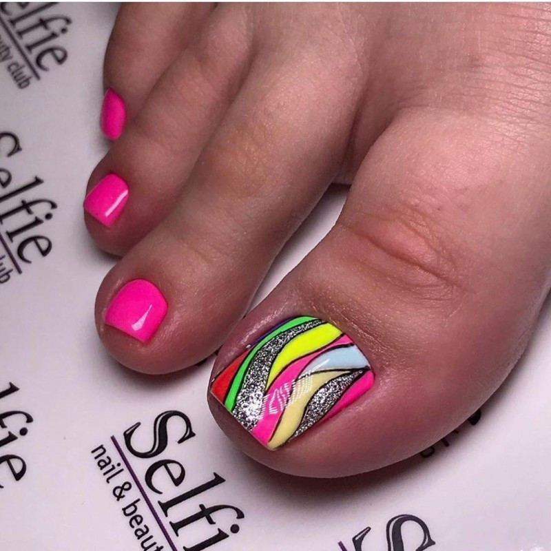 Как известно, молодое поколение испытывает некую слабость к всевозможным неоновым оттенкам и колерам в стиле «вырви глаз», поэтому дизайнеры предложили уверенно использовать подобные варианты покрытий для создания модного летнего педикюра. Это может быть однотонный дизайн, выполненный неоновым жёлтым, лимонным, зелёным, голубым или розовым цветом, педикюр с яркими рисунками, геометрическими композициями, элементами «негативного пространства» или растяжкой. Столь броские цвета можно дополнительно комбинировать с классическим белым либо чёрным цветом, дополнять объёмными украшениями и прочим декором