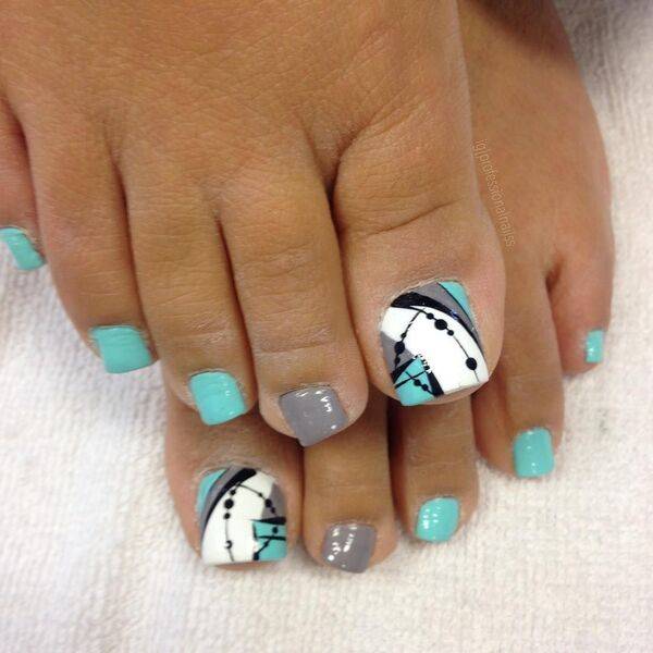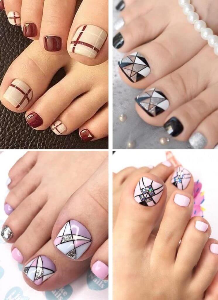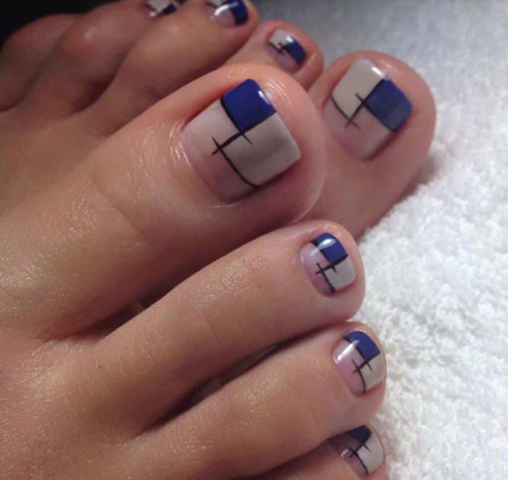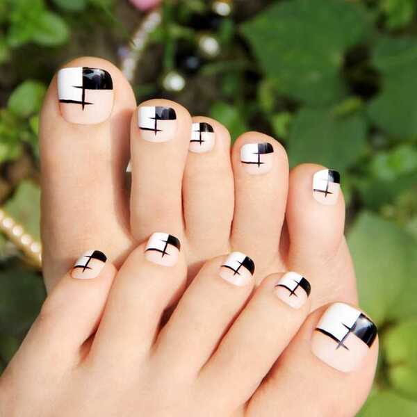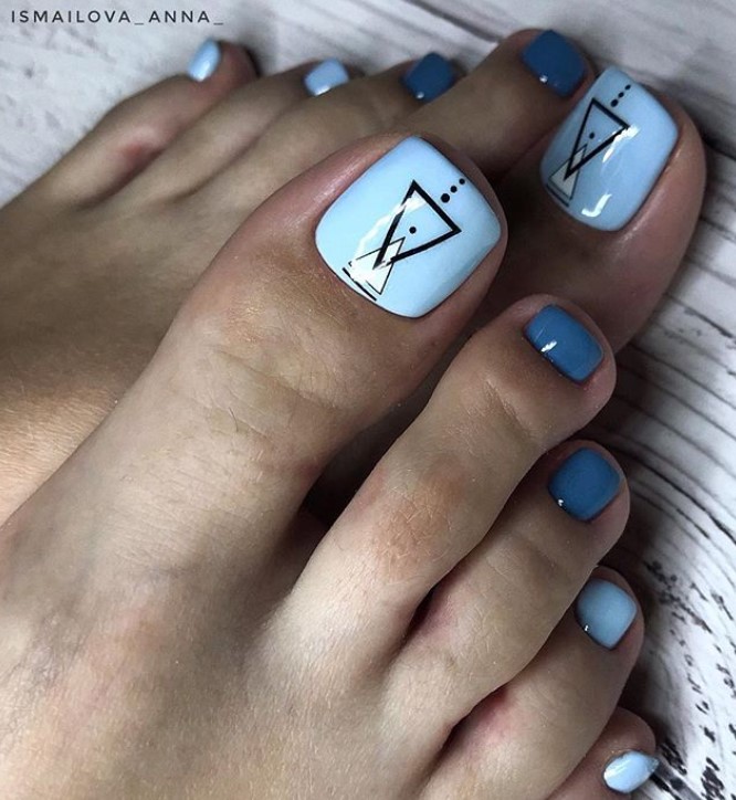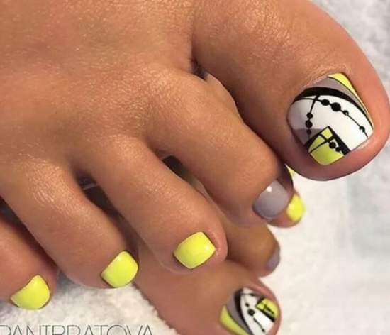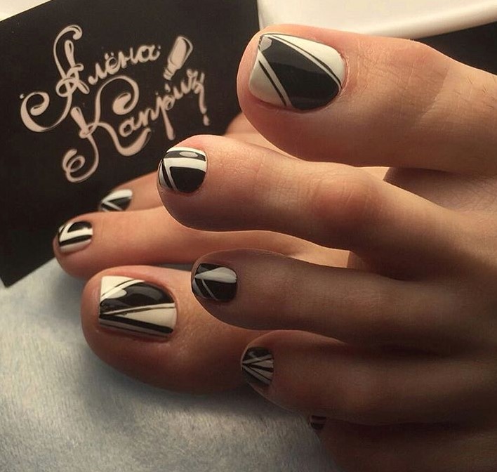- геометрический педикюр с выделением очертаний рисунка ярким неоновым лаком или покрытием базовых оттенков — черным, белый, синим, бежевым.