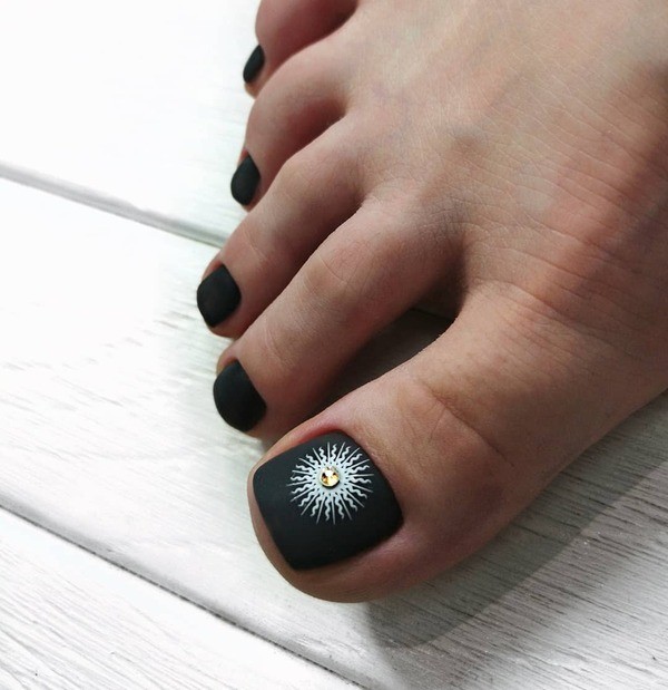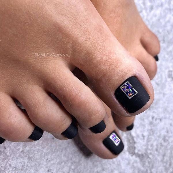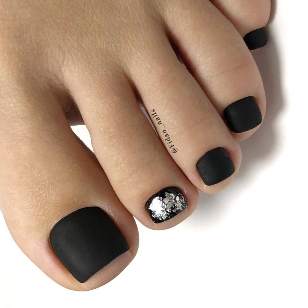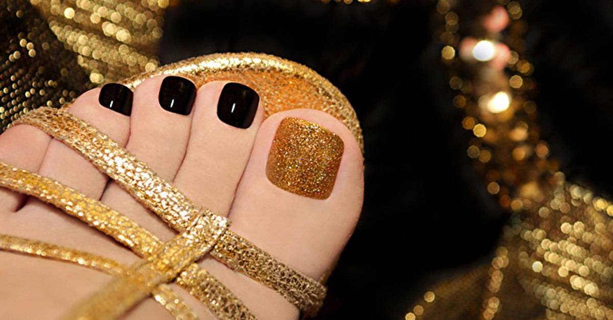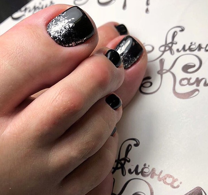 Еще одна бесспорная классика, от которой многие женщины по какой — то причине отказываются. Часть из них считают, что педикюр с черным лаком будет выглядеть слишком мрачно. Это не так. Черный лак не просто позволяет создать стильный педикюр, но является всесезонным оттенком. Кроме того, он отлично вписывается в образ с любым цветом открытой обуви. Черные обязательно добавит образу элегантности и дерзости. Если простой черный оттенок кажется вам слишком скучным, попросите мастера покрыть его сверху светоотражающим топом.