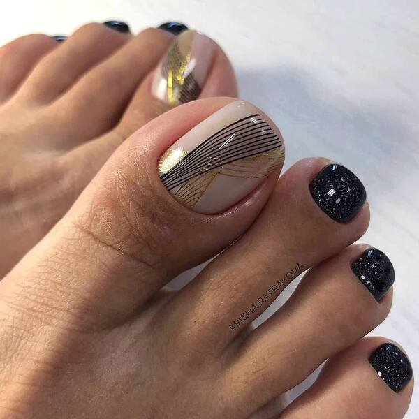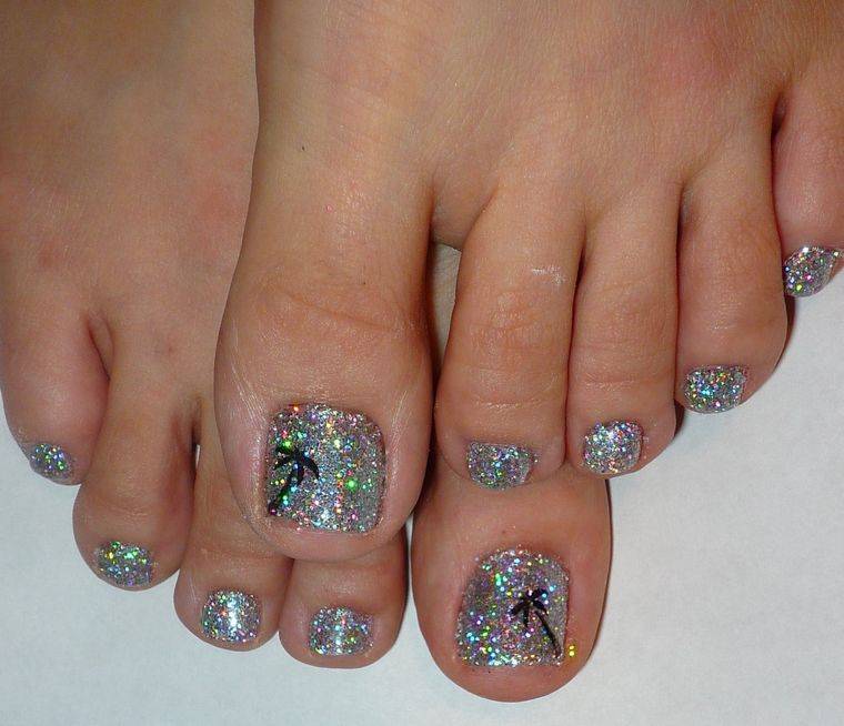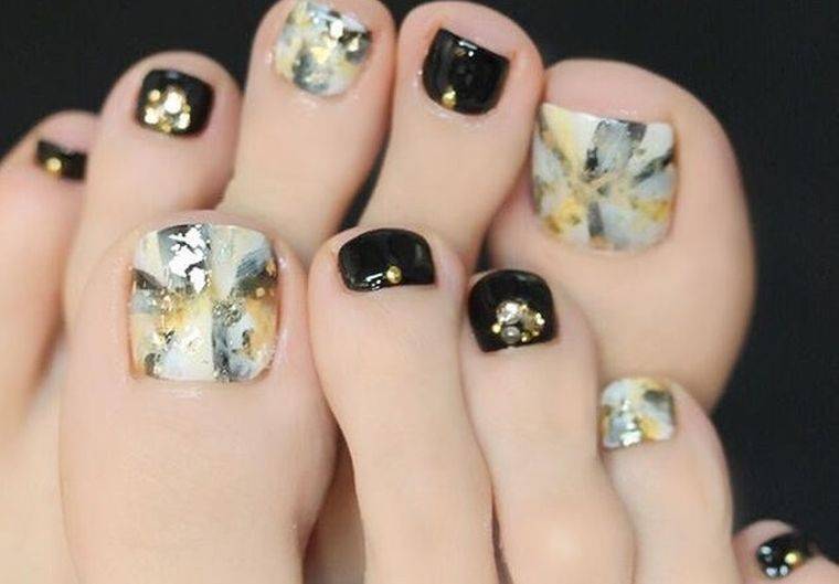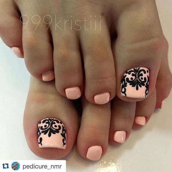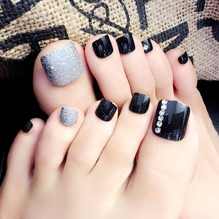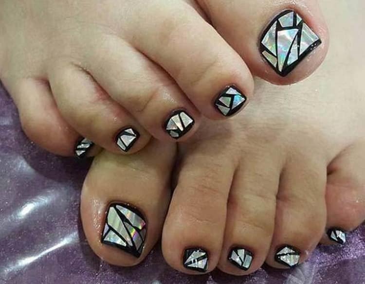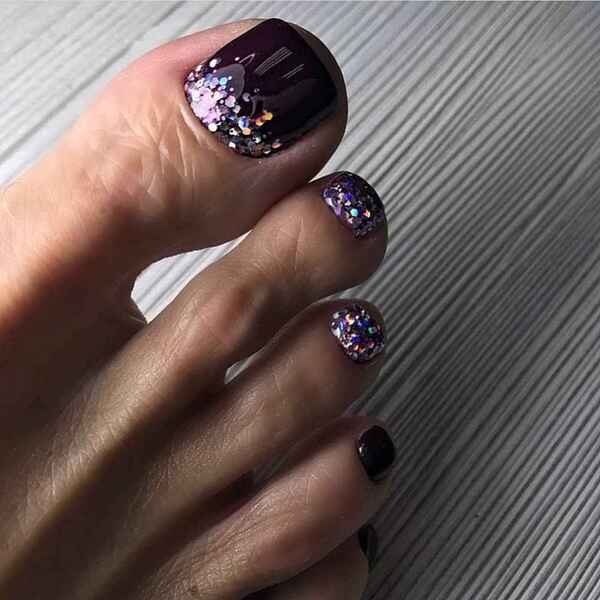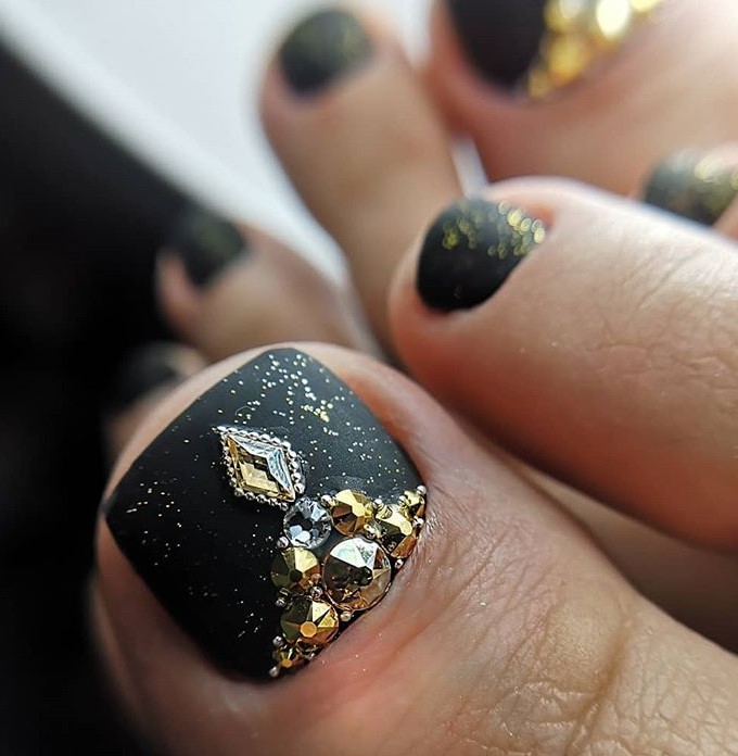 Еще одна бесспорная классика, от которой многие женщины по какой — то причине отказываются. Часть из них считают, что педикюр с черным лаком будет выглядеть слишком мрачно. Это не так. Черный лак не просто позволяет создать стильный педикюр, но является всесезонным оттенком. Кроме того, он отлично вписывается в образ с любым цветом открытой обуви. Черные обязательно добавит образу элегантности и дерзости. Если простой черный оттенок кажется вам слишком скучным, попросите мастера покрыть его сверху светоотражающим топом.