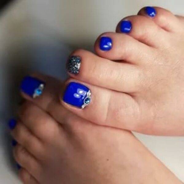 Палитра синего не менее богата, чем у других цветов. В этом сезоне список трендов возглавляет оттенок синий электрик. И вообще стильный педикюр немыслим без насыщенных синих оттенков.