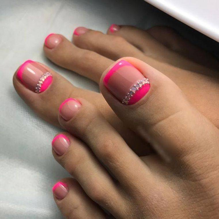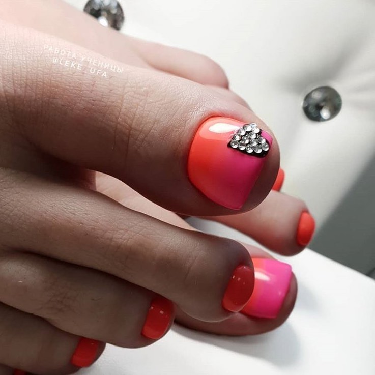 Когда как не летом использовать неоновые лаки для создания стильного педикюра. Довольно часто неоновые оттенки попадают в немилость мастеров и модниц. Считается, что маникюр — педикюр, в котором они использованы, будет пошлым и чрезмерным. Но только не в этом сезоне. Не бойтесь быть дерзкими и смелыми. Особенно эффектно — неоновые оттенки смотрятся на загорелой кожи ног. Самыми эффектными считаются неоновый, розовый, оранжевый и желтый.