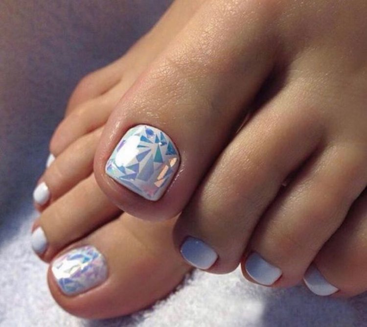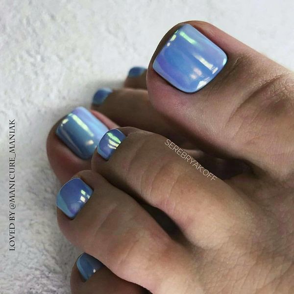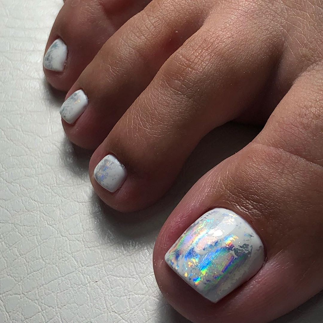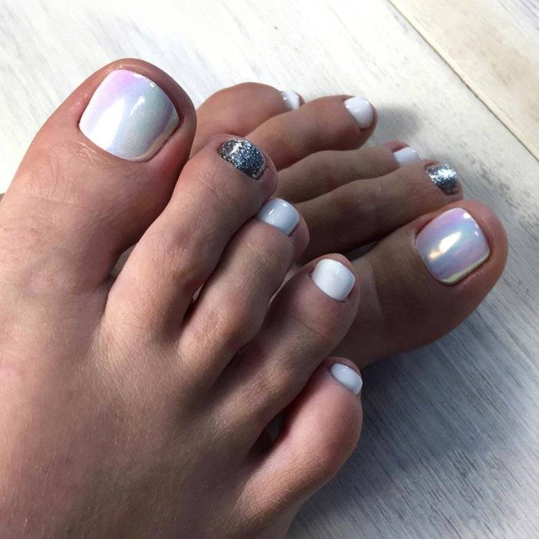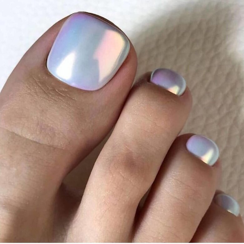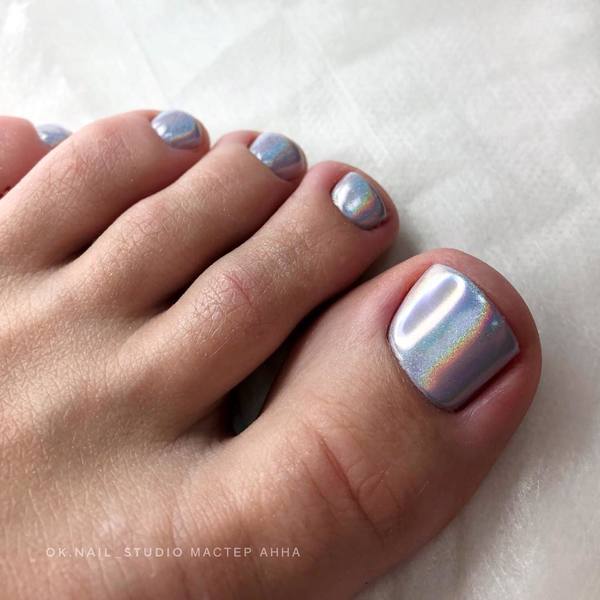 Этот вид дизайна уже давно завоевал популярность среди модниц. Однако для маникюра он кажется самым ярким, поэтому его принято делать не на всех ногтях. А вот для педикюра — самое то! Тем более, что голографическая втирка признана одним из трендов весны 2024 года.