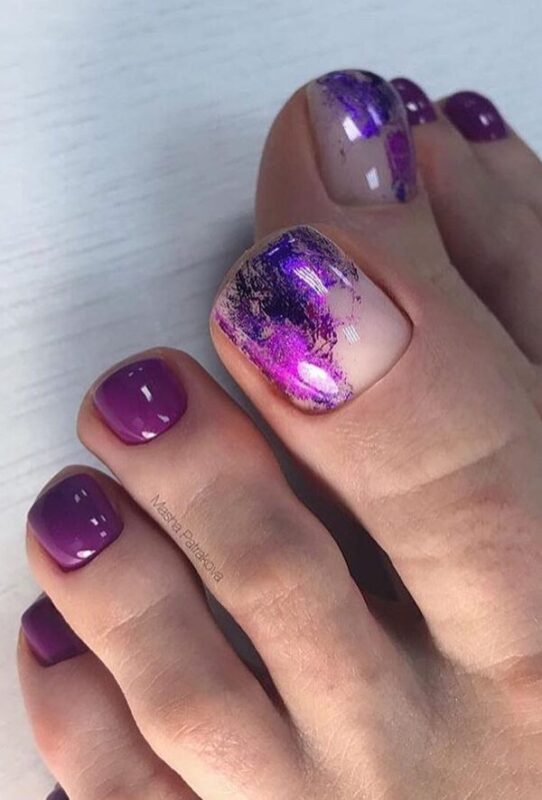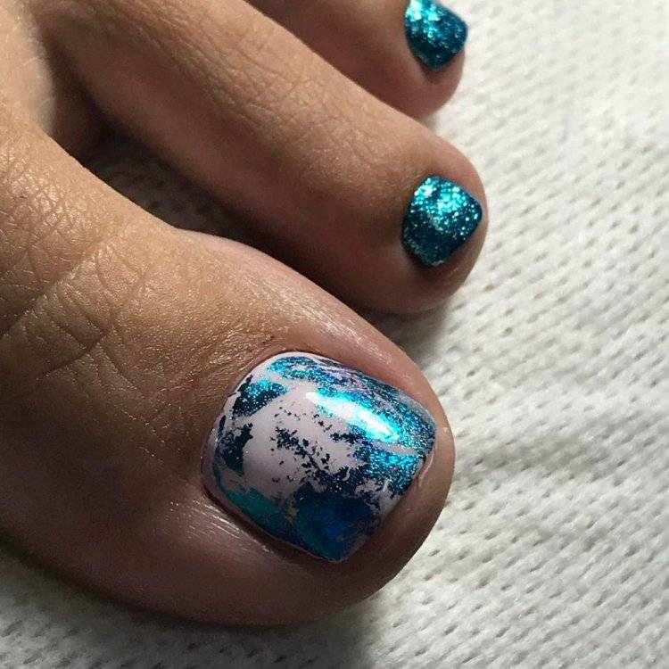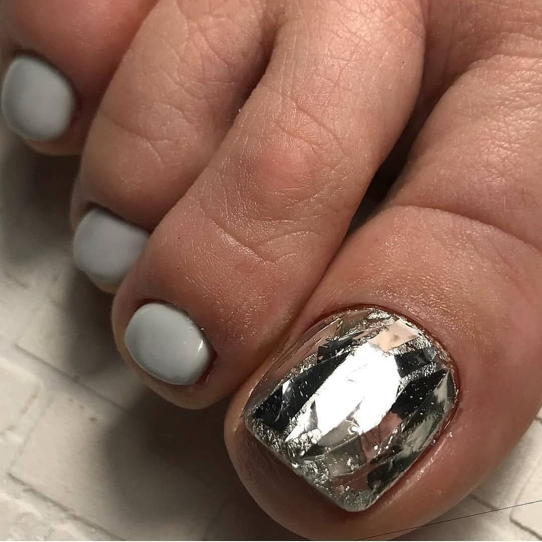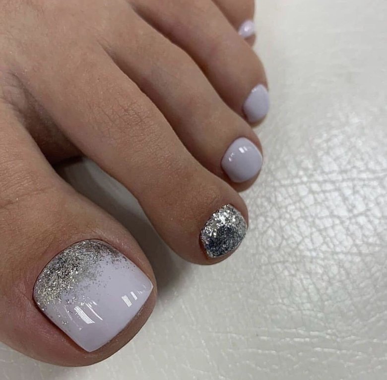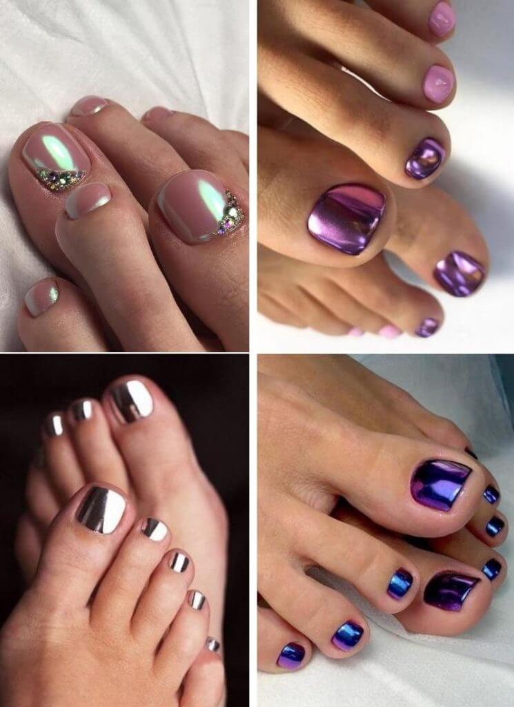 Этот вид дизайна уже давно завоевал популярность среди модниц. Однако для маникюра он кажется самым ярким, поэтому его принято делать не на всех ногтях. А вот для педикюра — самое то! Тем более, что голографическая втирка признана одним из трендов весны 2024 года.