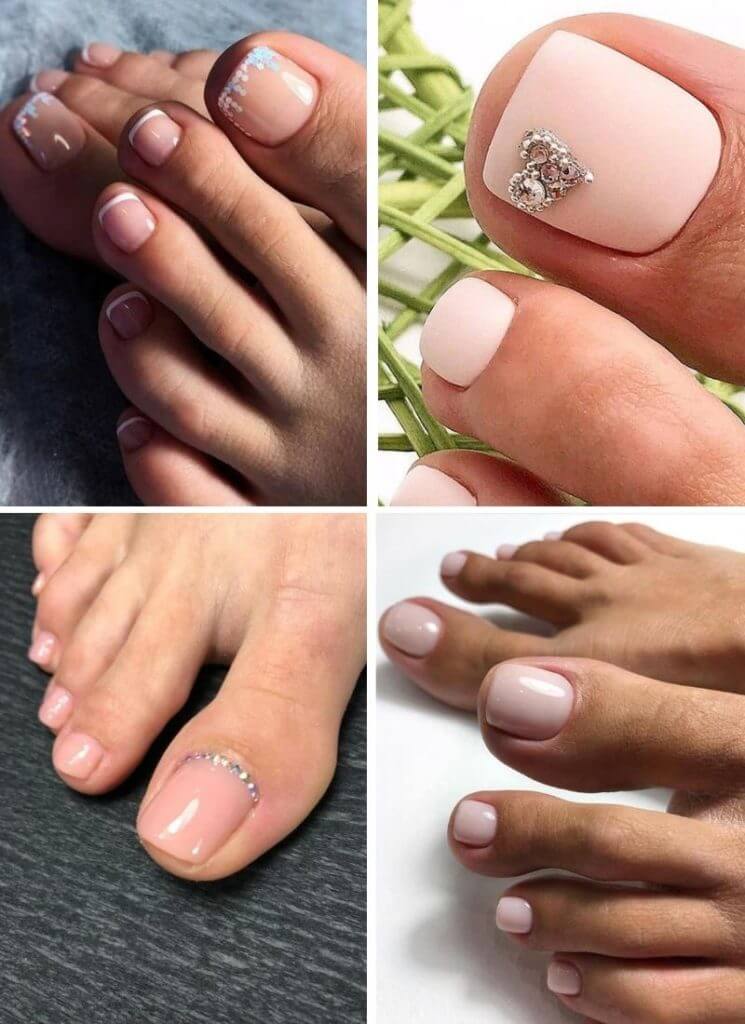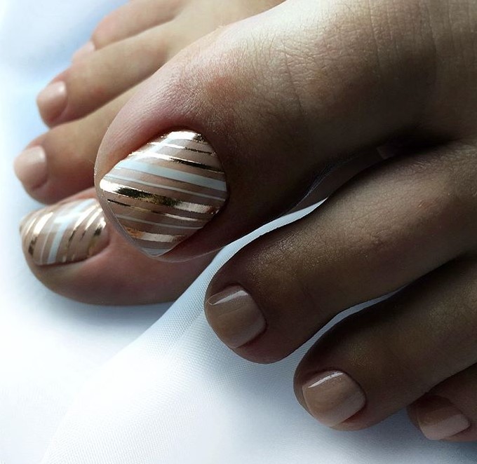 Этот вариант можно отнести к самым спокойным универсальным. Такие оценки стоит выбирать, если вы не можете определиться, какой сделать педикюр. Но при этом вам хочется, чтобы он был очень стильным и модным. Какие оттенки подойдут для создания интересного дизайна, который подойдет под любую открытую обувь.