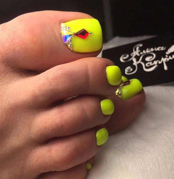 Как известно, молодое поколение испытывает некую слабость к всевозможным неоновым оттенкам и колерам в стиле «вырви глаз», поэтому дизайнеры предложили уверенно использовать подобные варианты покрытий для создания модного летнего педикюра. Это может быть однотонный дизайн, выполненный неоновым жёлтым, лимонным, зелёным, голубым или розовым цветом, педикюр с яркими рисунками, геометрическими композициями, элементами «негативного пространства» или растяжкой. Столь броские цвета можно дополнительно комбинировать с классическим белым либо чёрным цветом, дополнять объёмными украшениями и прочим декором