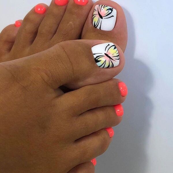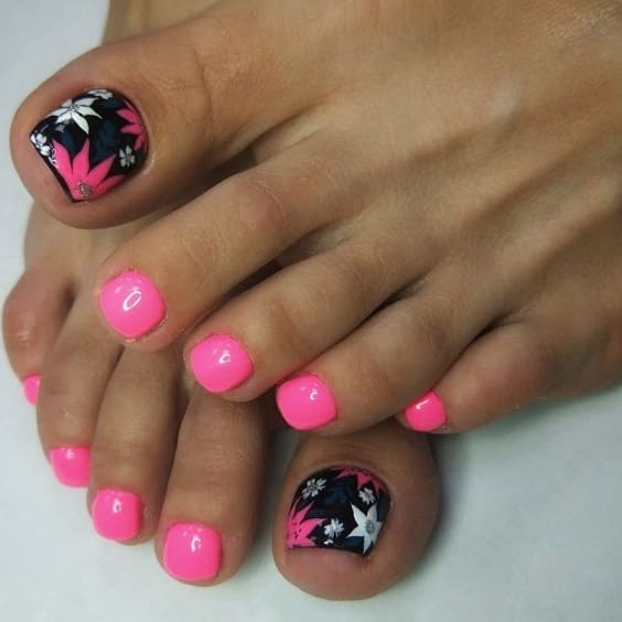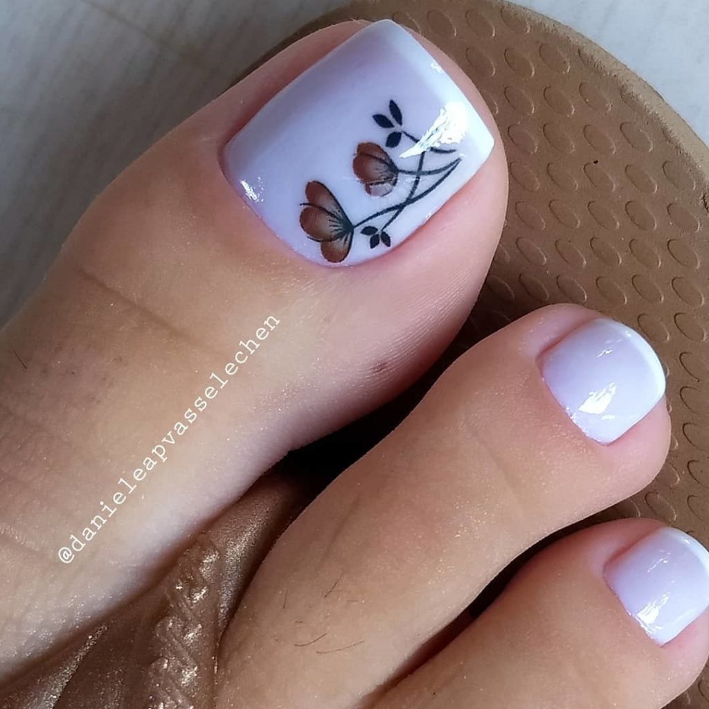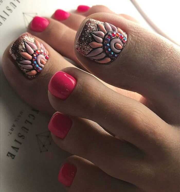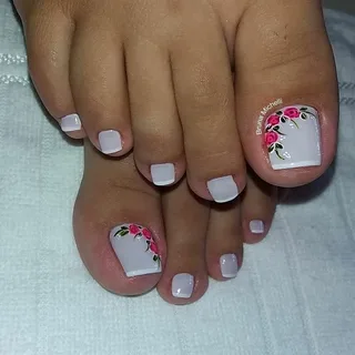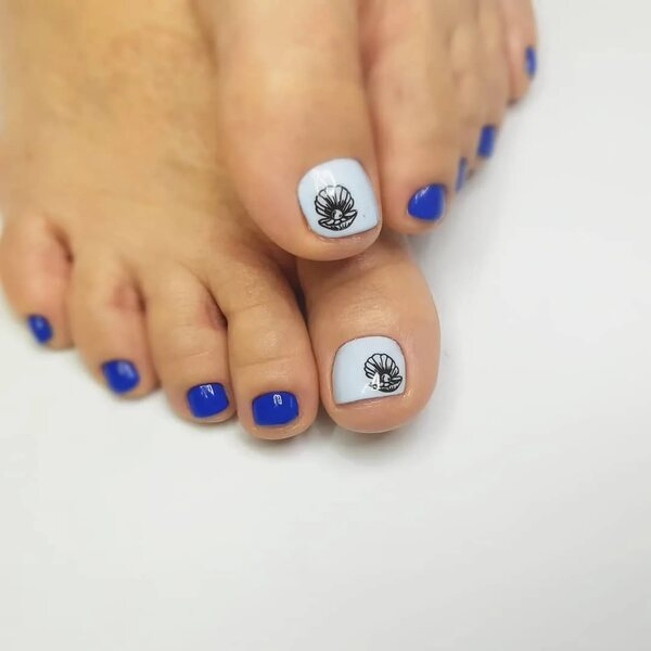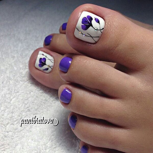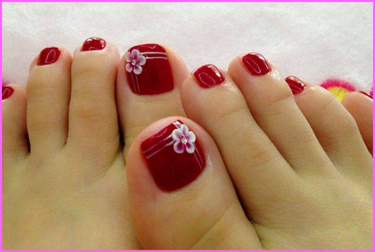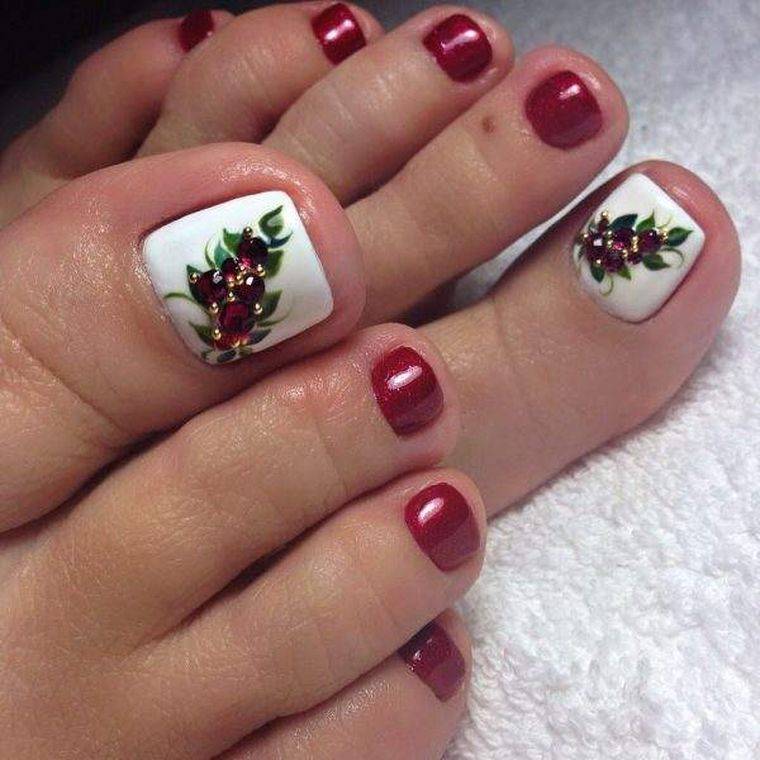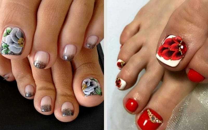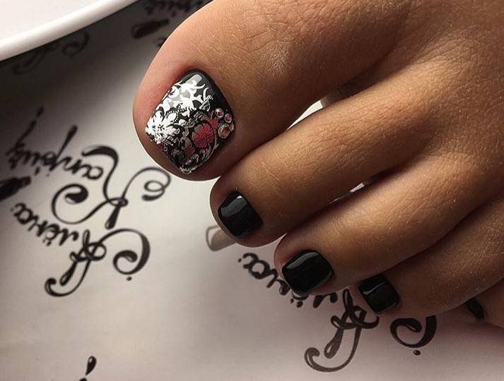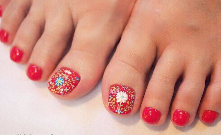 Цветы разных форм и оттенков на ногтях особенно актуальны в теплое время года. Когда кажется, что цветы должны расти не только на клумбе, но и на ногтях. Флористика позволяет мастеру сочетать разные цвета — черный и красный, белый и синий и многие другие варианты — на что хватит фантазии. Также образцы для такого покрытия и идеи можно брать в народных узорах. Например, хохлома и гжель очень выгодно будут смотреться на большом пальце ноги.