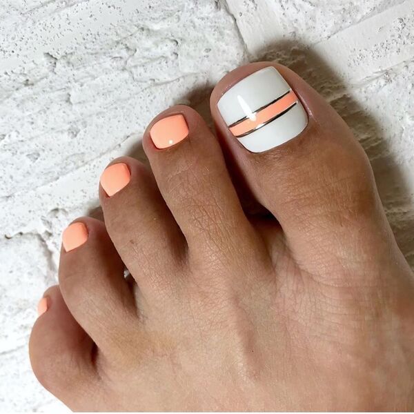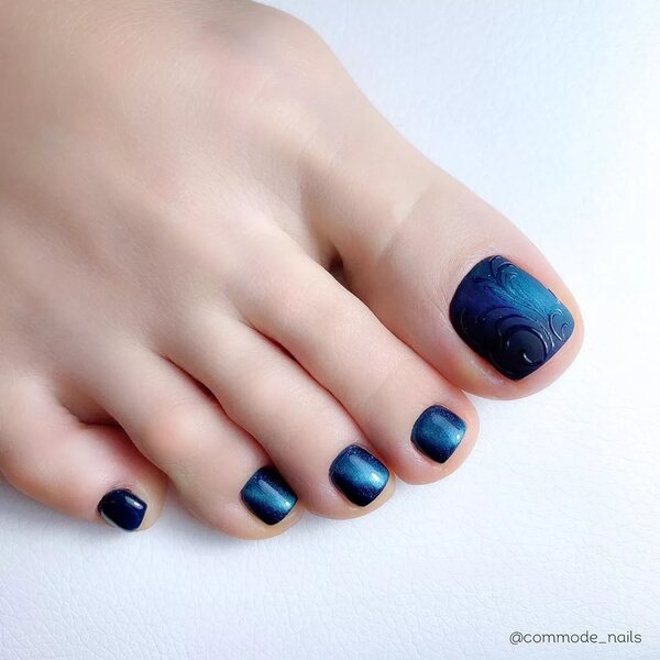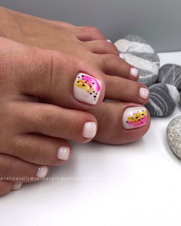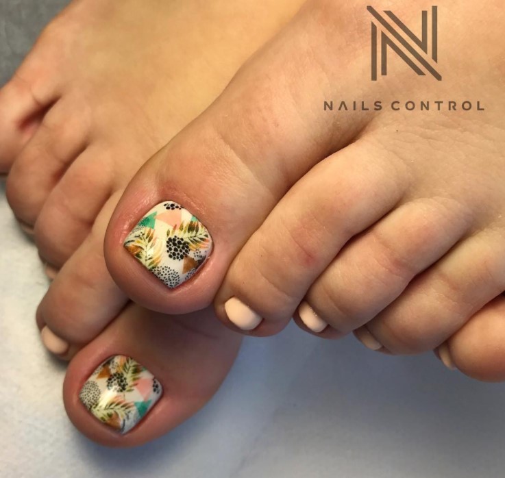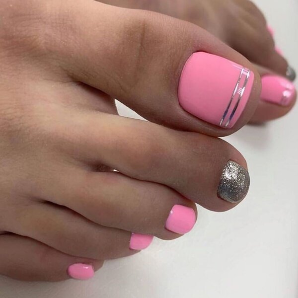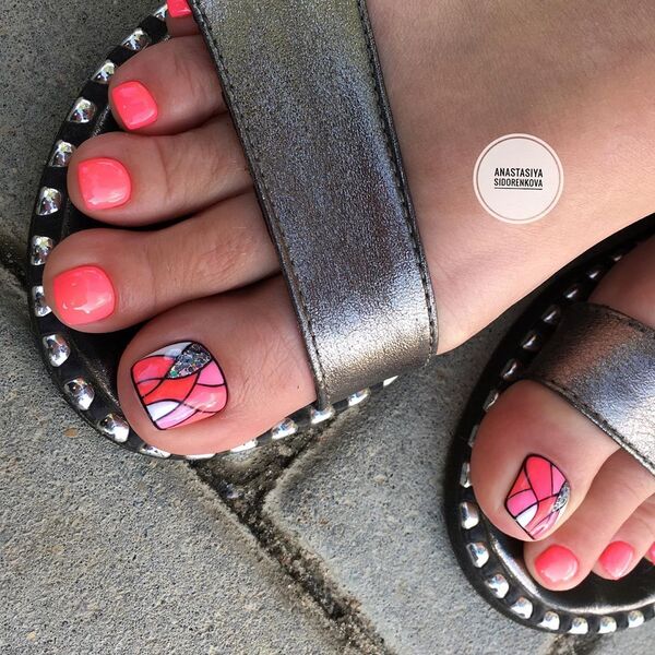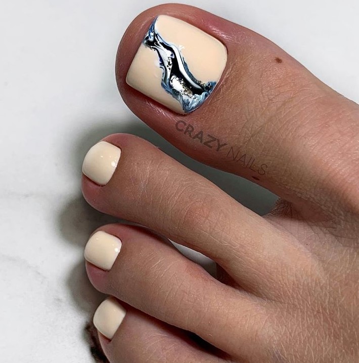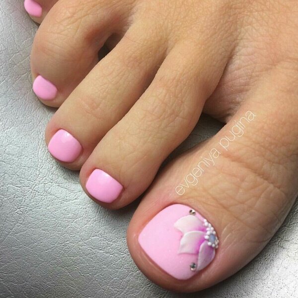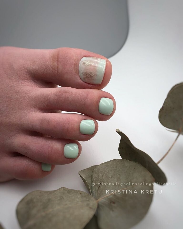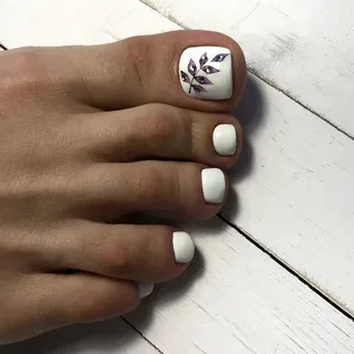 Клиентка не хочет делать слишком яркий дизайн? Тогда предложите педикюр с дизайном на большом пальце. Основные ногти можно сделать однотонными, а для экспериментов оставить самый крупный палец.