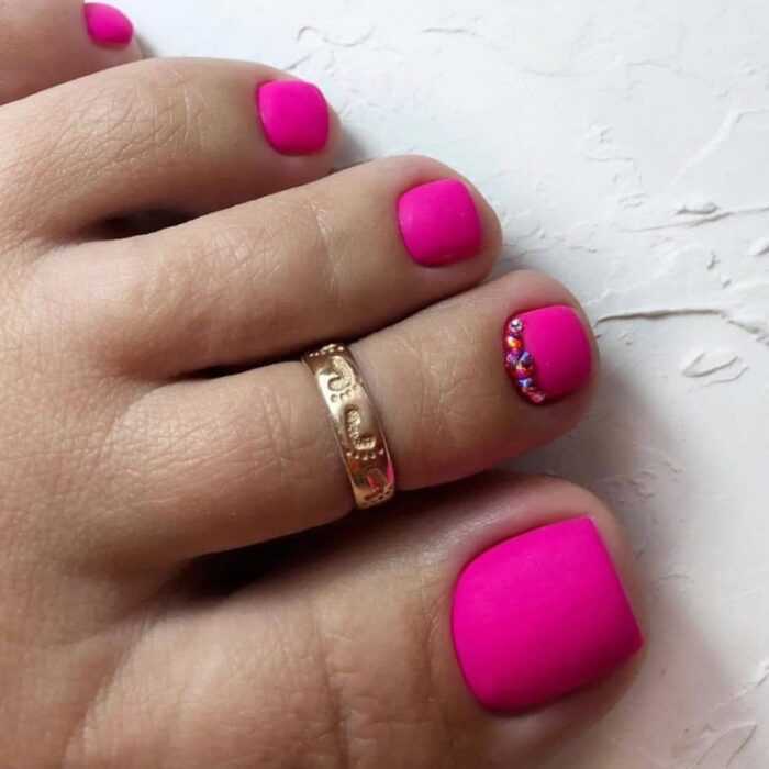 Еще один тренд сезона — розовые матовые ногти. Это очень девичий дизайн, часто ассоциируется с куклами Барби, но его выбирают дамы всех возрастов. Он прекрасно подойдет как школьницам, так и взрослым женщинам. Такой педикюр нейл-мастера часто разбавляют цветочными узорами. На розовом фоне особенно красиво будут смотреться пионы, розы и полевые цветы. Допустимо также украшение в виде блесток — они удачно дополнят дизайн и придадут образу праздничный вид.