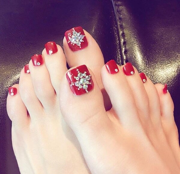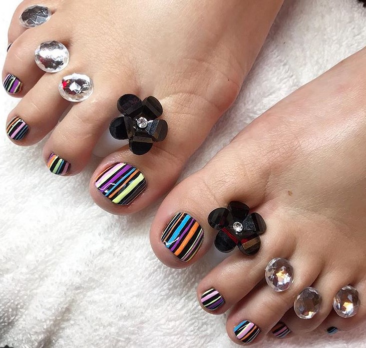 Во — первых, такие объемные элементы на ногах создают очень серьезные неудобства. Прежде всего придется очень тщательно подбирать обувь, чтобы не возникало трения сжатия и других неприятных моментов. И тем не менее может случиться ситуация, когда ремешок или какая-то деталь обуви может травмировать ноготь. Кроме того, стильный педикюр и стразы не совместимы. Украшения с камнями лучше оставить для маникюра.