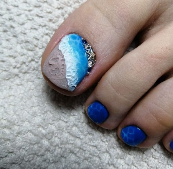 Если педикюр делается перед отпуском, можно поиграть с тематикой моря. Например, разместить на краю ногтя рисунок волны или даже изобразить кораллы, ракушки или морских рыбешек.