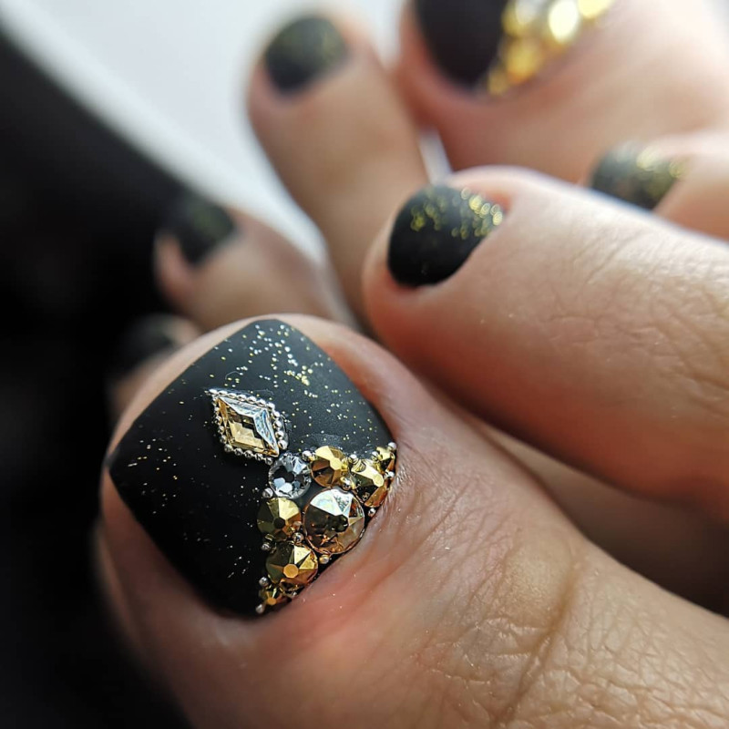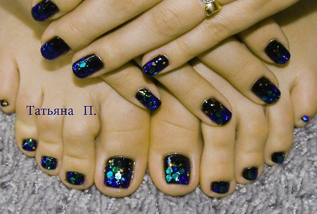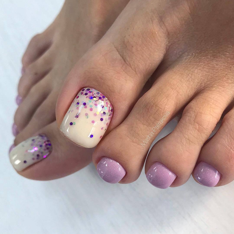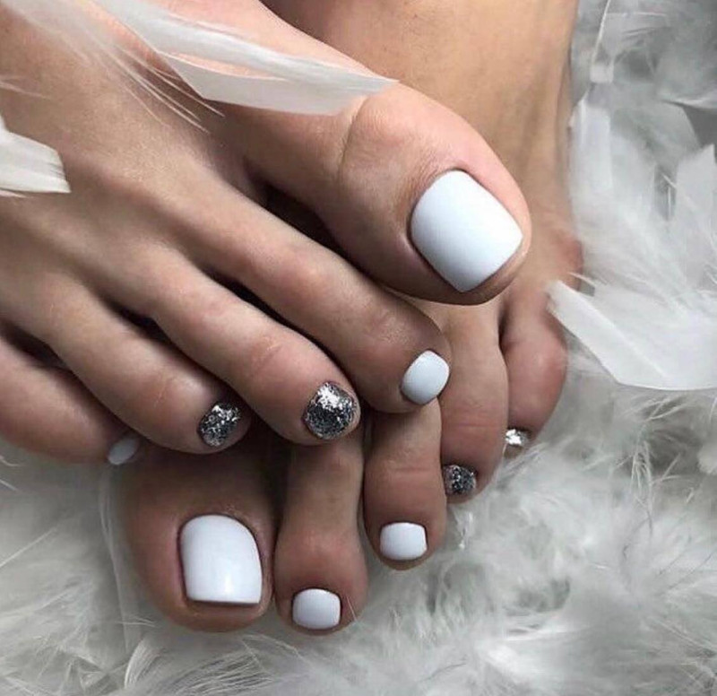 - Блестки всегда популярны! Выбрав глиттер, можете нанести его либо на все ногти, либо выборочно на некоторые. Красивый педикюр будет обеспечен.