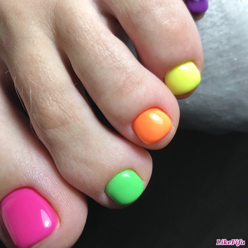 - Радуга на ваших ноготках поднимет настроение и вам, и окружающим. Можно начать цвета с мизинца одной ноги и продолжить на другой, что будет выглядеть необычно и ярко.