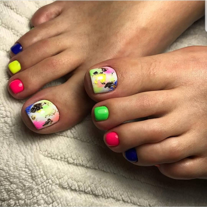 - Для разнообразия палитры можно использовать неоновые тона. К тому же, если у вас смуглая кожа или летний загар, педикюр будет выглядеть великолепно и по-летнему сочно. Смело останавливайте выбор на ярких и неожиданных оттенках.