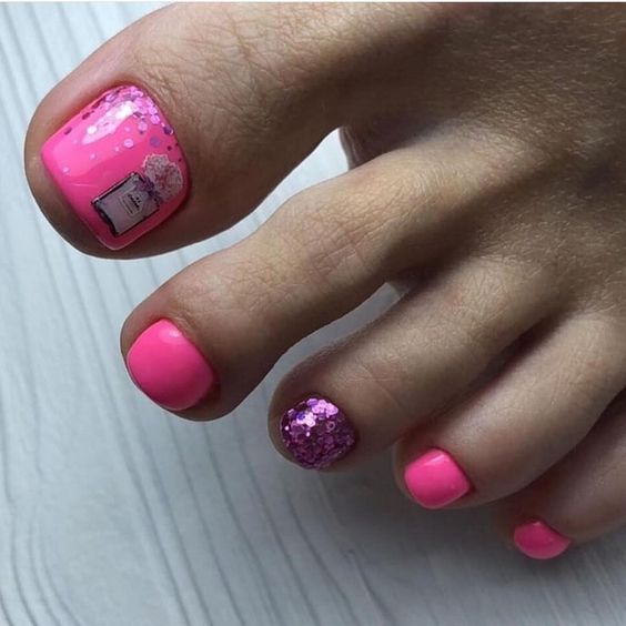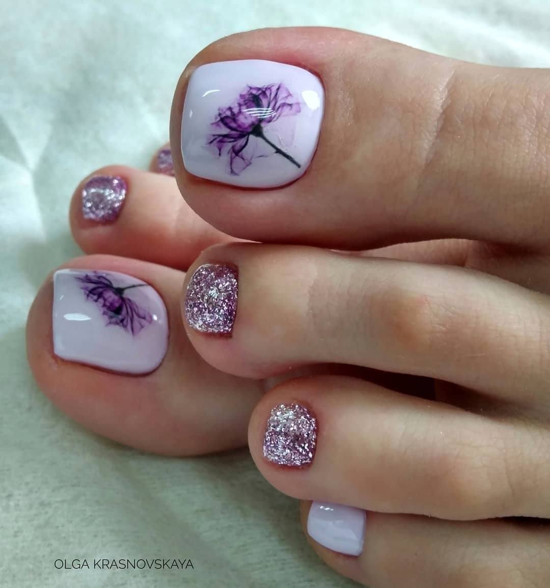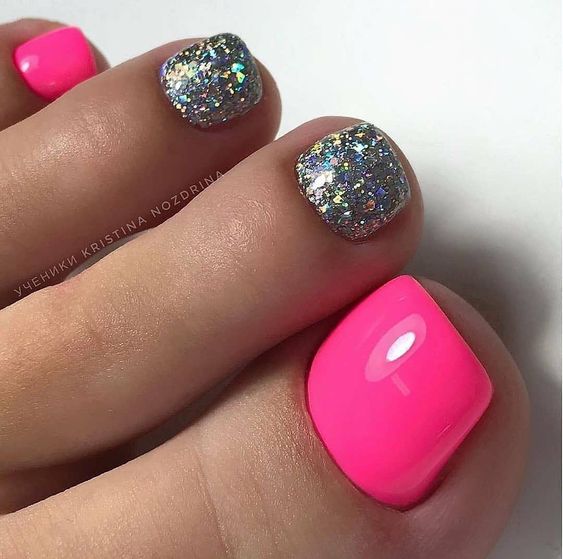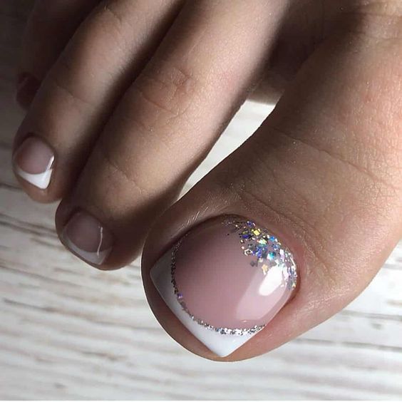 - Блестки всегда популярны! Выбрав глиттер, можете нанести его либо на все ногти, либо выборочно на некоторые. Красивый педикюр будет обеспечен.