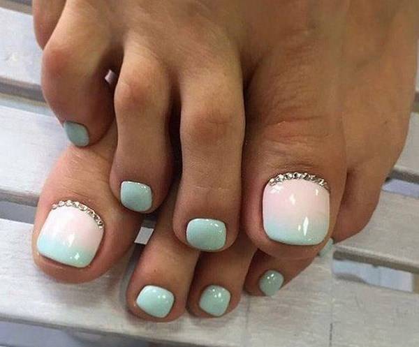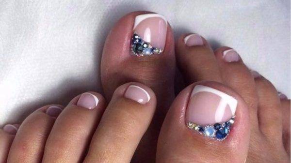 Дизайн френч на ногах со стразами пользуется большой популярностью у женщин: