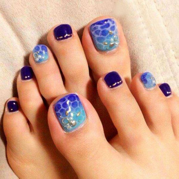 Морские кораллы, раковины, рыбки – замечательный вариант нейл-арта для ног, который просто идеально впишется в отдых на пляже. Если вы хотите создать педикюр в настоящем морском стиле, можете окрасить ногти в стильную полоску как на тельняшке.
