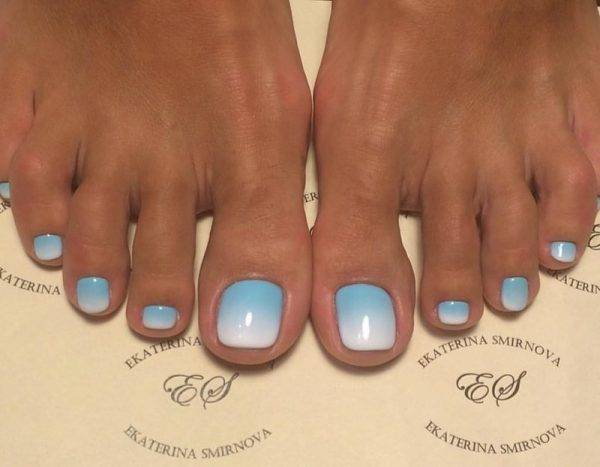 Мягкий и плавный переход будет гармонично смотреться на ножках только в том случае, если при создании омбре будет использоваться не более двух-четырех оттенков. При выборе оттенков очень внимательно отнеситесь к их подбору – они должны находиться в одной цветовой гамме и наноситься по нарастающей: от темного к самому светлому или от светлого к самому темному. Суть подобного дизайна заключается в плавном переходе одного цвета в более темный другой.