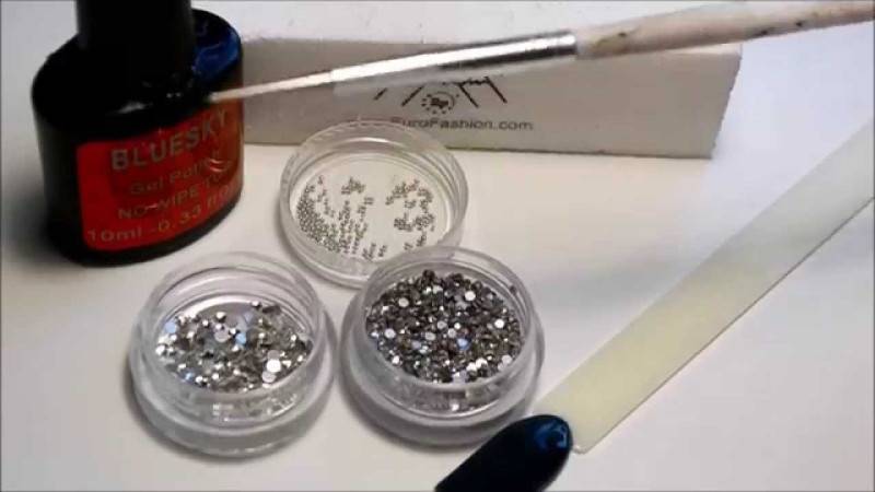 Ни в коем случае нельзя пользоваться не специализированным клеем. Иногда девушки приклеивают стразы к ногтю суперклеем и жалеют об этом, так как из-за него портится пластина. В случае, если специального клея не нашлось, можно воспользоваться небольшим количеством прозрачного лака. Он гораздо хуже держит стразы, но не портит ноготь. После нанесения клея или лака страз нужно плотно прижать и подержать в течение нескольких секунд. Далее его не следует тревожить во избежание отпадывания.