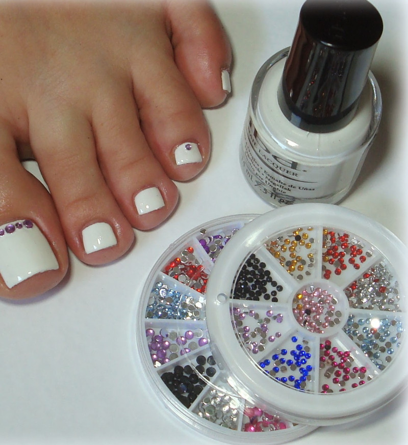 Правильные материалы для ногтевог осервиса плоские с одной стороны и выпуклые с другой. Плоская сторона хорошо приклеивается к ногтю специальным клеем. Для того, чтобы педикюр сверкал, лучше подобрать сверкающие стразы. В лучах солнца они покажут себя во всей красе.