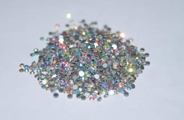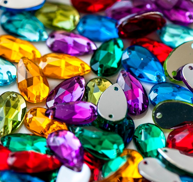 Стразы – это блестящие украшения разных размеров, которые имитируют драгоценные камни. Для их изготовления используют различные материалы: пластик, стекло, цирконий, горный хрусталь. Эти декоративные камешки имеют две стороны: плоскую, которая приклеивается к основе, и выпуклую, которая и создает декор.