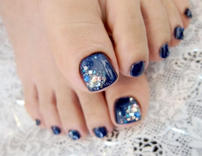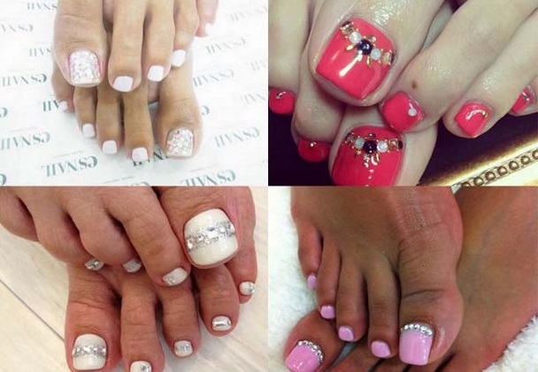 На средний ноготь всегда крепиться только один небольшой камешек. А вот ноготь на большом пальце украшаем более заметно. Если ноготь полностью покрыть стразами, то это будет выглядеть необычно и торжественно. Можно взять лишь один цвет, или же камешки всевозможного оттенка. Дерзайте, и ваш педикюр будет самым шикарным!