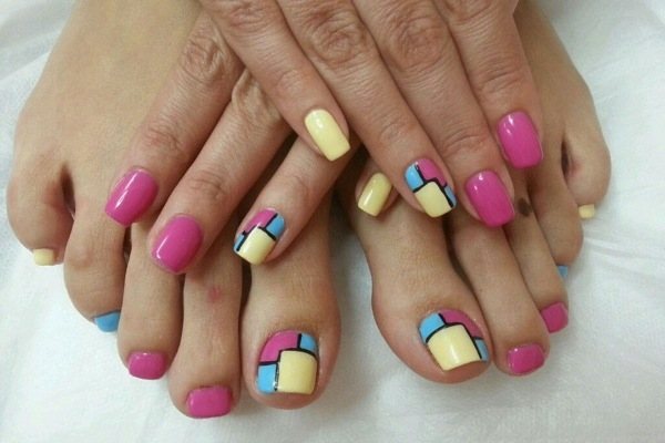 И не ограничивайте себя. Современные тенденции не предполагают парное сочетание — педикюр и маникюр в одной цветовой гамме. Вы можете сделать яркий красивый педикюр при классическом однотонном маникюре. Но все же будет лучше, если ногти рук и ног будут оформлены в одной цветовой гамме или хотя бы близкой.