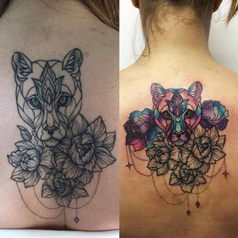 Черно-белые и серые тату лучше забивать цветной краской. Предыдущий темный цвет накладывает ограничения по выбору палитры.