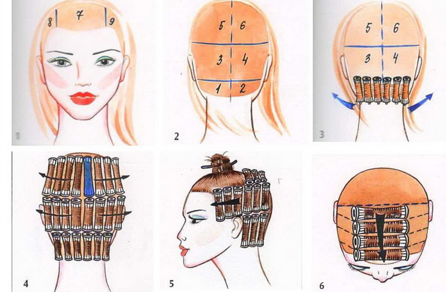 - Начинают накручивать пряди с фронтально-теменной зоны от центра к бокам до нижнезатылочной зоны.