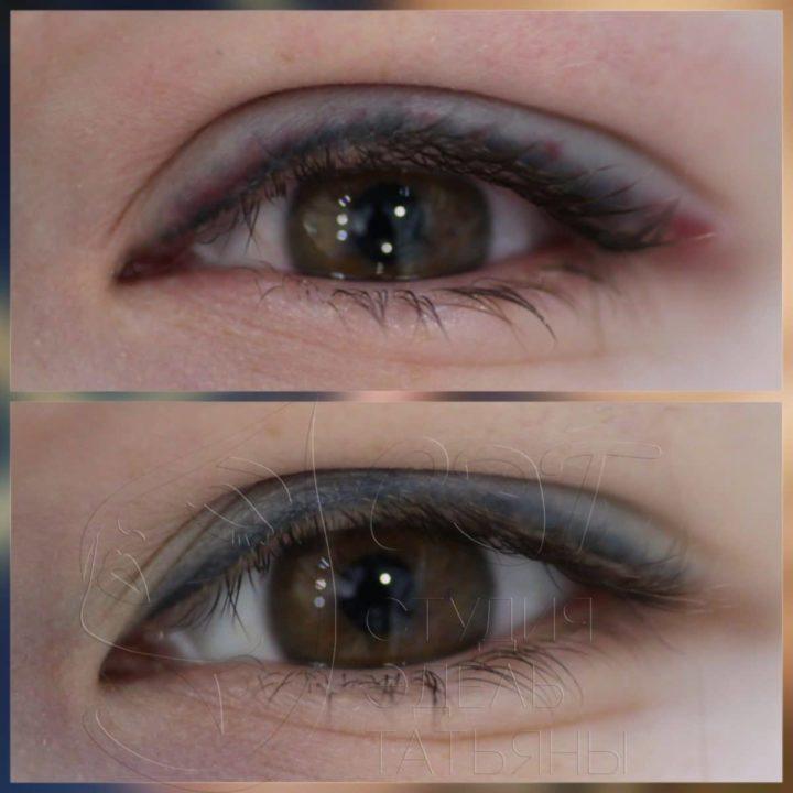 Верхнее или нижнее веко вполне можно сделать более выразительным при помощи перманентного макияжа. Зачастую мастера выполняют верхнее веко, как аккуратную стрелочку, или же делают натуральный с виду эффект густых ресниц, проводя четкую или немного растушеванную линию у основания ресниц. Таким же образом обрабатывается и нижнее веко. Процедура корректирует форму глаз.