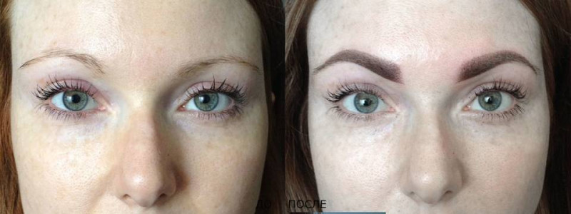 Пожалуй, самый популярный вид перманентного макияжа. Женщины стремятся обзавестись идеальными по цвету и форме бровями, потому что именно от них во многом зависит впечатление от лица в целом. Изменяя форму бровей, можно скорректировать овал лица. Например, восходящие брови сузят широкий лоб и добавят объем нижней части треугольного лица. Горизонтальные прямые брови укоротят и расширят удлиненное лицо. Квадратное лицо сделают гармоничным не слишком длинные брови в виде плавной дуги. Какую бы форму бровей вы не выбрали, главное требование при татуаже — брови должны выглядеть натурально. Рассматривая фото до и полсе, не должно бросаться в глаза то, что над бровями поработал мастер перманентного макияжа.