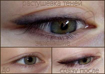 Эффект размытости маскирует мелкие морщинки. Татуаж выполняется различными цветами, но самым популярным остается черный, который не преломляется в тонкой коже век и не отдает синевой (см.фото)