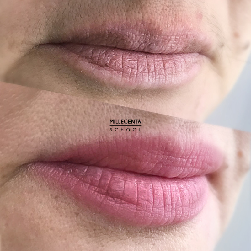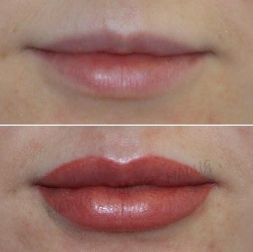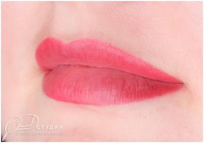Губки получаются естественными и равномерно окрашенными. Техника нанесения пигмента мелкими тонкими штрихами помогает добиться такого равномерного оттенка. Пигмент вбивается совсем неглубоко, поэтому выбранный для татуажа цвет максимально отображается и на губах. Количество красителя также минимально, поэтому создается не просто эффект накрашенных, но просто слегка подкорректированных блеском губ.