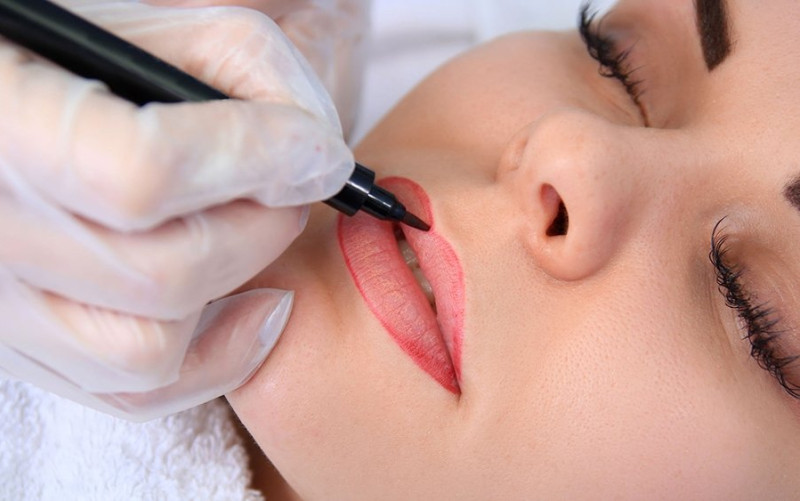 Процедура начинается с выполнения на губах эскиза. Его корректируют до тех пор, пока желаемая форма не будет достигнут. Затем мастер приступает нанесению контура.