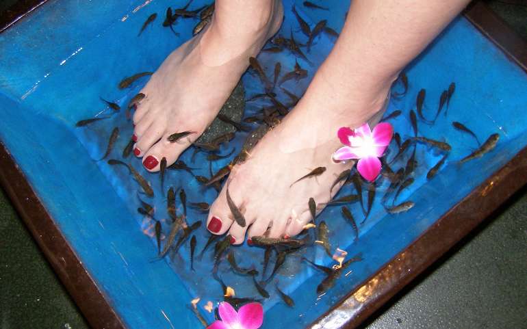 - экзотический педикюр рыбками Гарра Руфа. Ступни опускают в небольшую емкость-аквариум, в котором плавают крохотные рыбки. Они эффективно удаляют размягчившиеся частички кожи. Сама процедура вызывает приятные ощущения с легкой щекоткой;