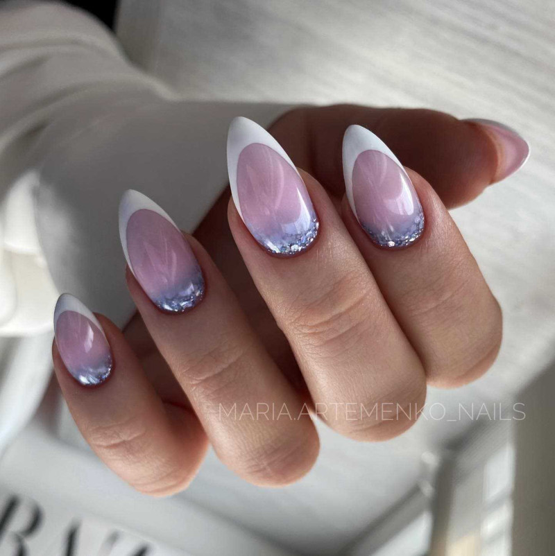 - Френч. Бессмертная классика станет идеальным вариантом как для офисного стиля, так и для романтического свидания, вечеринки. Френч можно сделать привычным или обратным. Край ногтя оформляют не только белым, но и другим гель-лаком, отличающимся фактурой, тоном. Отличный вариант на квадратные ногти, формы миндаль.