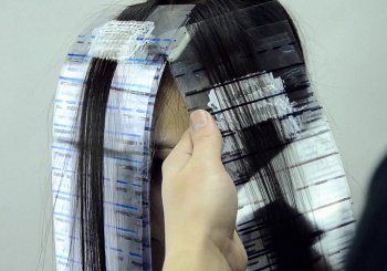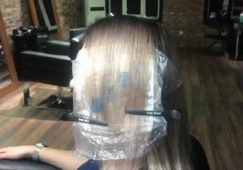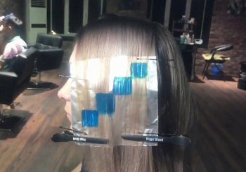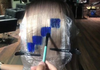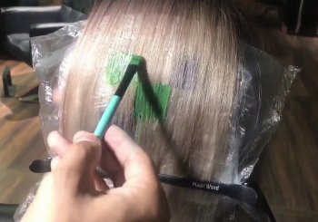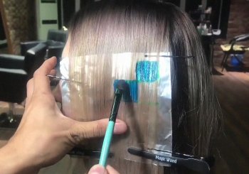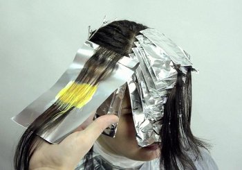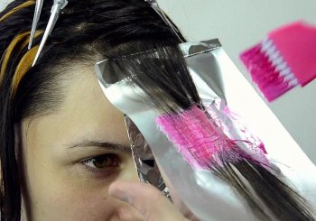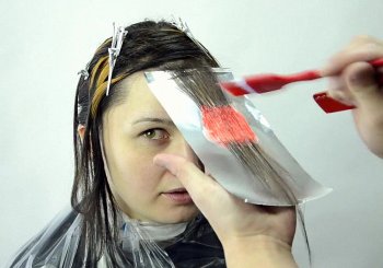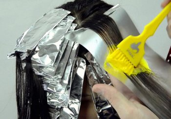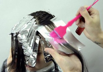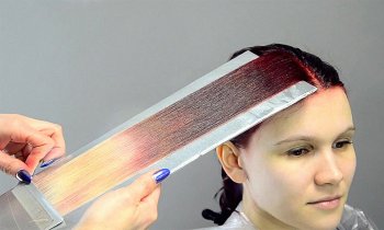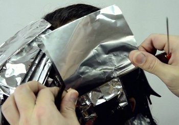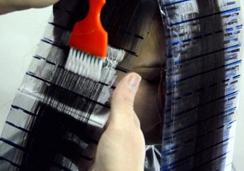 - От отделённой части волос берётся тонкий слой и накладывается поверх фольги. Кистью наносится краска по разметке. Затем на окрашенные волосы накладывается полиэтилен и крепится зажимами к волосам с фольгой.