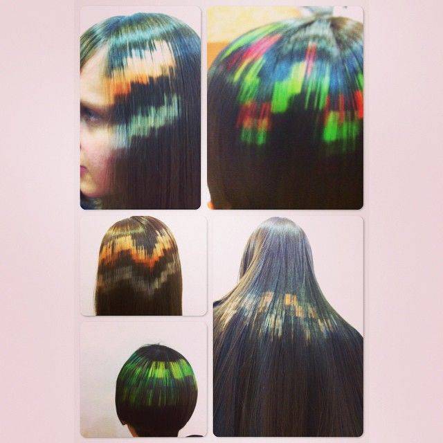 - Обладательницам вьющихся локонов и девушкам после хим. завивки. Пиксель-арт эффектно смотрится только на прямых, гладких и хорошо уложенных прядях. Мелкие кудряшки и крупные локоны не позволяют подчеркнуть геометрический рисунок, нанесенный на прическу.