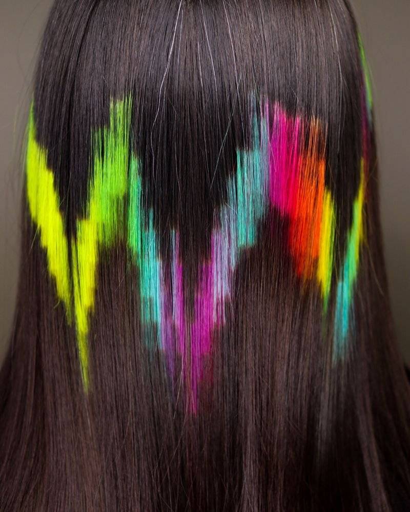 - Неоновые пряди получаются в результате использования особенной смеси с сияющими частичками в составе. Прическа особенно эффектно выглядит в сумерках и темноте.