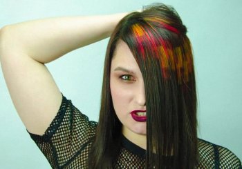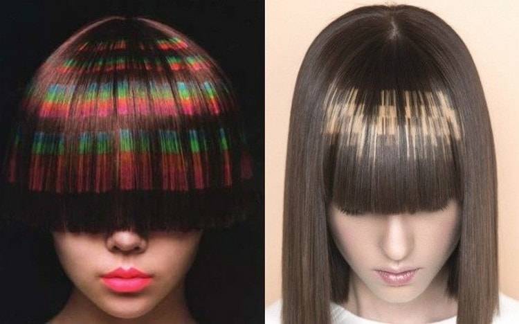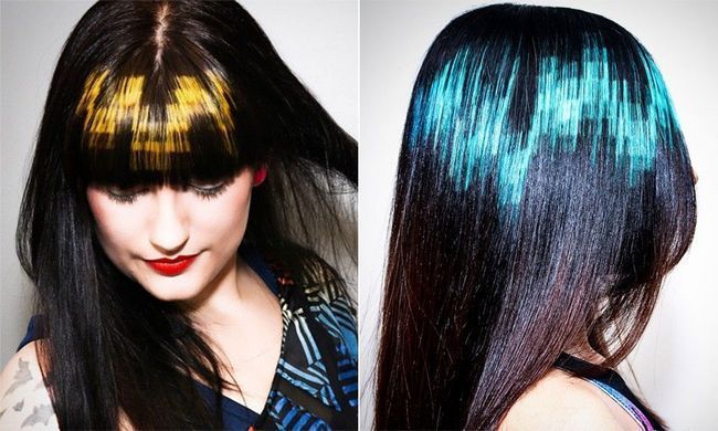 Модная техника необычного воздействия на волосы основана на покраске локонов слоями. Прическа создается при помощи нанесения на пряди определенного геометрического рисунка и использования своеобразного сочетания цветных локонов.