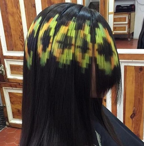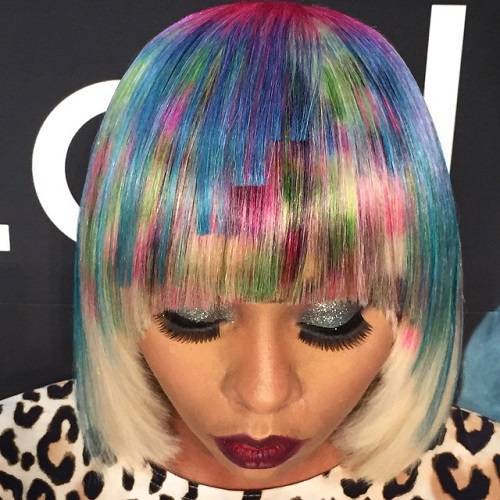 Колорированная пикселями прическа всегда получается креативной и яркой. Для вечеринки – как раз то, что надо. А прогулявшись с такими волосами по городу, можно стать объектом повышенного внимания и ловить восхищенные и удивленные взгляды.