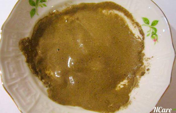 - Смешать в равных частях сухой порошок бодяги и белую глину, а затем разбавить водой и перемешать до консистенции сметаны.