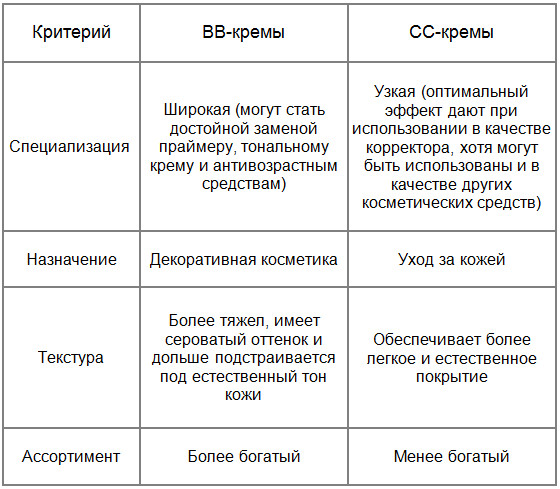 Разница между BB и CC-кремами менее ощутима и нагляднее всего прослеживается при помощи таблицы.