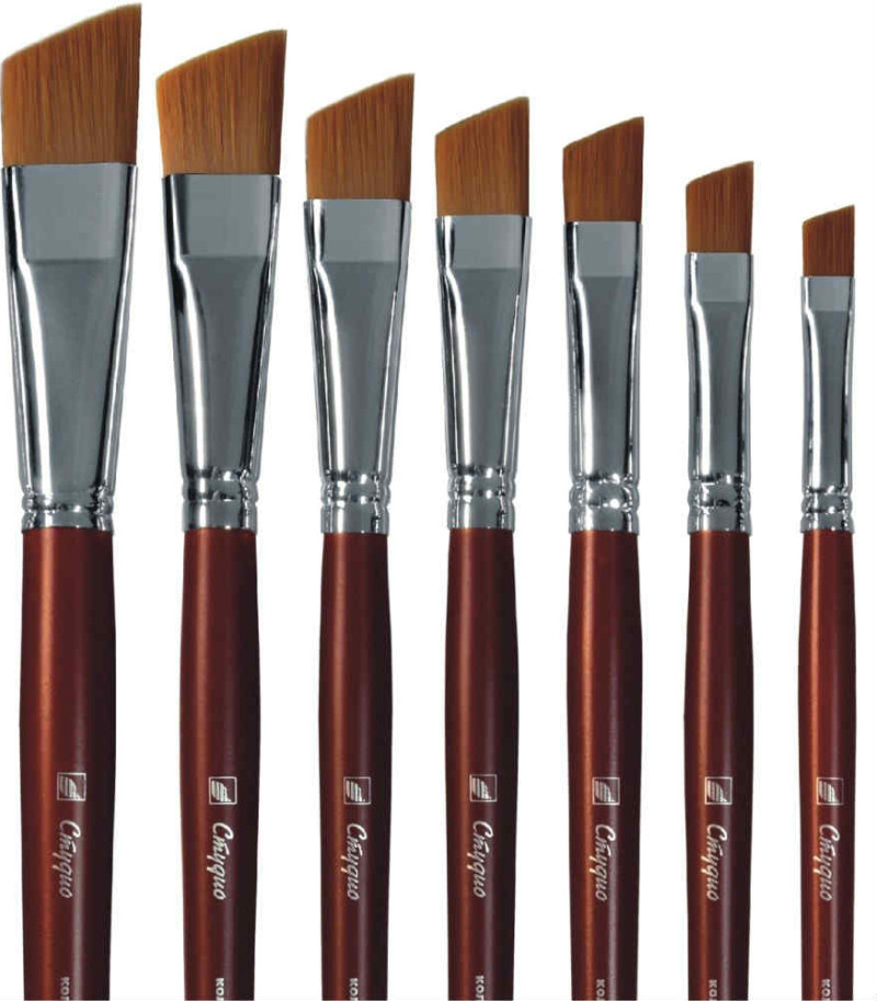 ретушные кисти из-за характерного скошенного под углом пучка, называют скошенными. Обычно они используются для эскизов и набросков, поскольку линии, проведенными ими, получаются очень четкими с очерченными углами. Также они нужны для рисования точных мазков в труднодоступных местах работы;