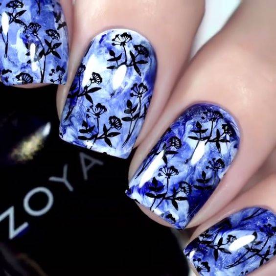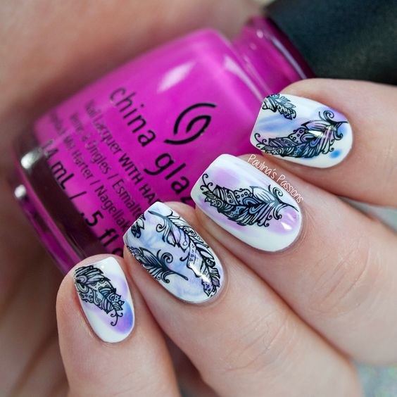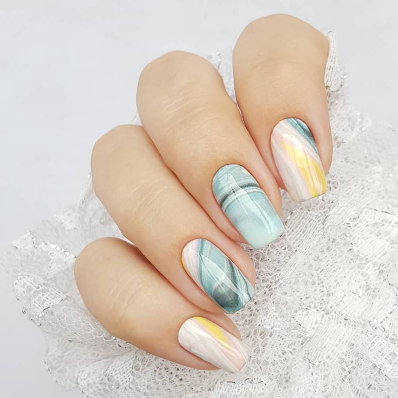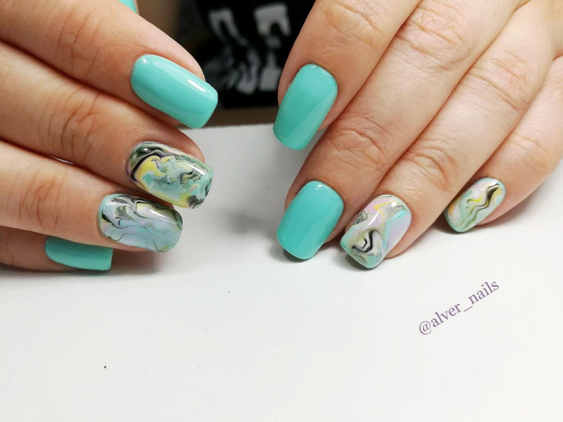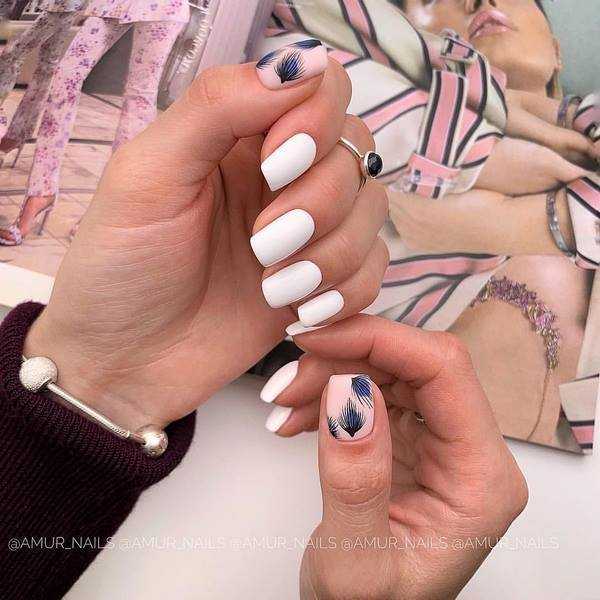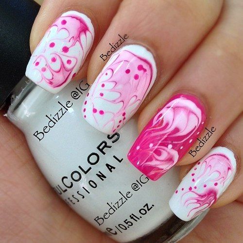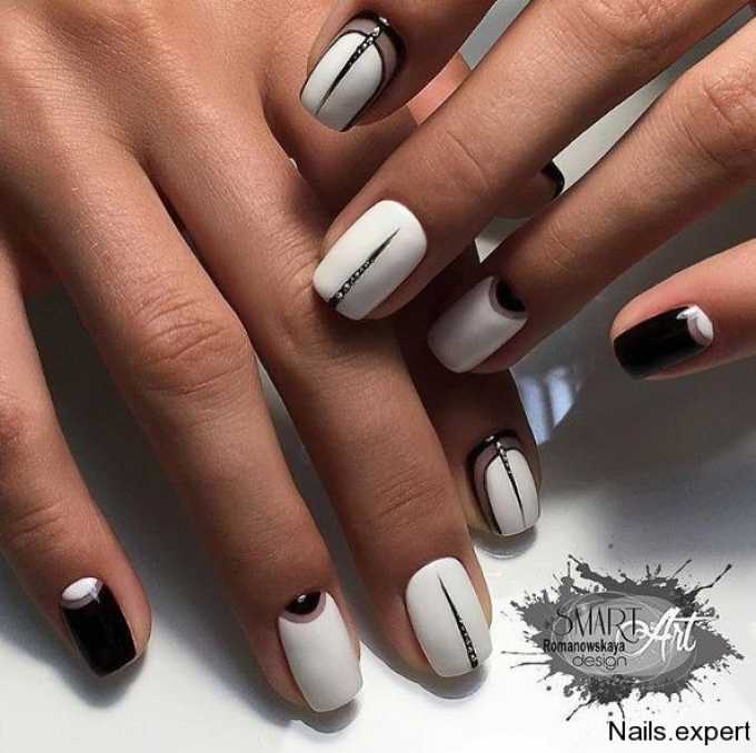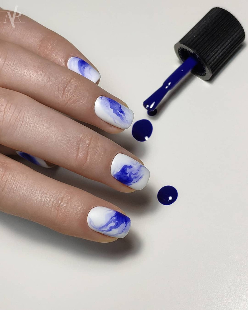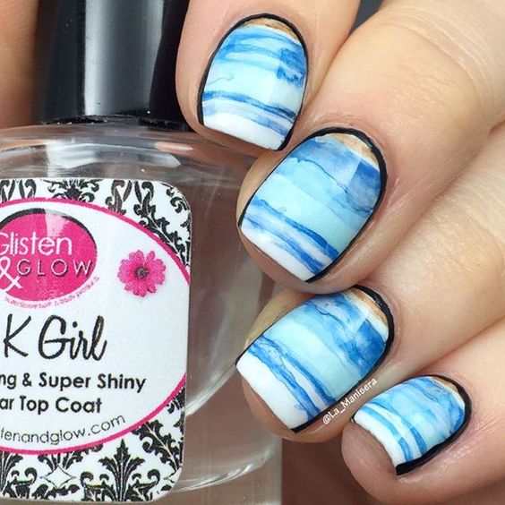 Для создания такого дизайна за основу используется гель-лак белого цвета, а за разводы берутся любые другие оттенки. Один из самых популярных вариантов — черные полосы на белом фоне.