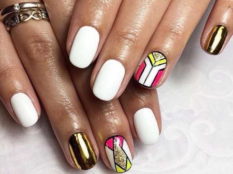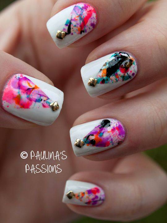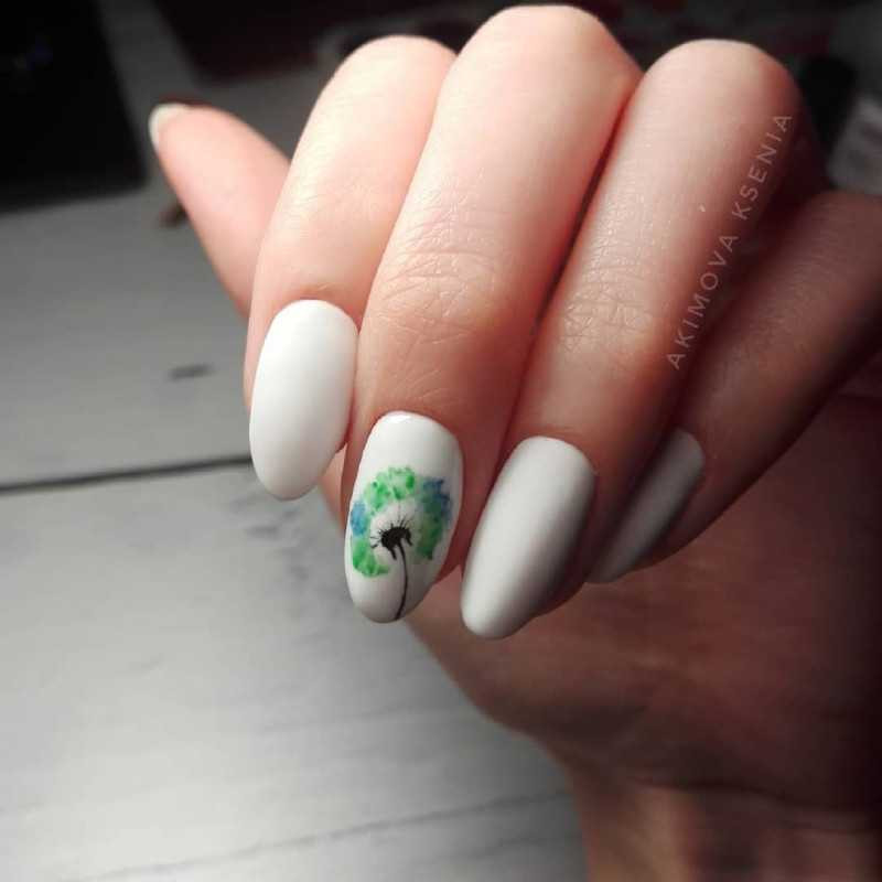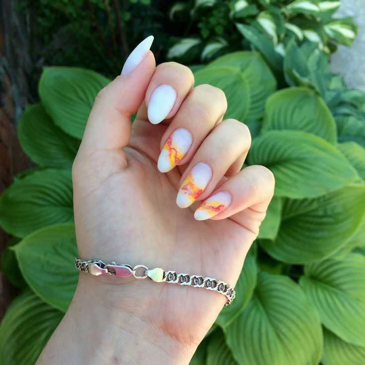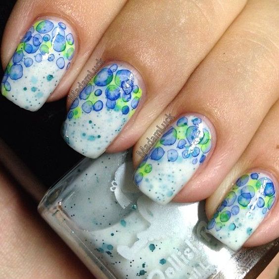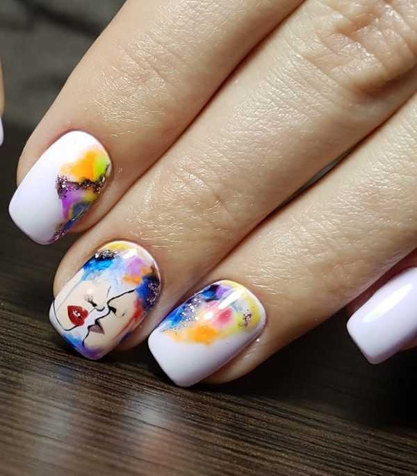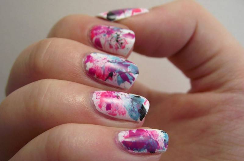 Белый маникюр с пятнами подойдет к любому образу. В зависимости от цвета можно получить как повседневный маникюр, так и праздничные дизайны.